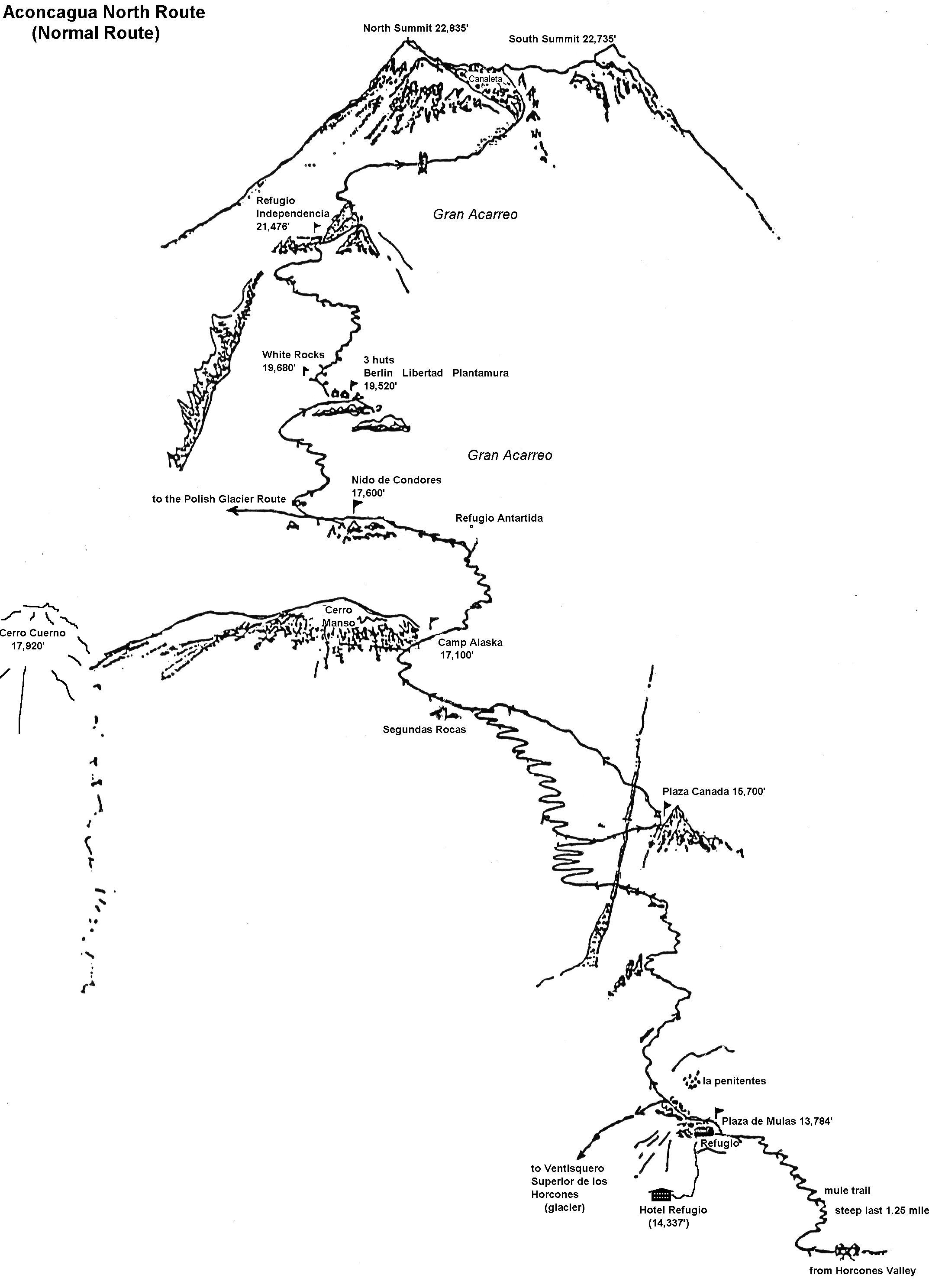 The route for the Horcones Valley on Aconcagua starts from the road at Puente Del Inca with a two day walk up the Horcones Valley (stopping at Confluencia along the way to acclimatise), a long and dry valley all the way to Plaza del Mulas. The weather can be very extreme, either very hot and dusty or with the potential for snow, wind, hail and storms. The route has stunning views of surrounding peaks and cliffs, with dramatic striations and colours especially with the setting sun on them.