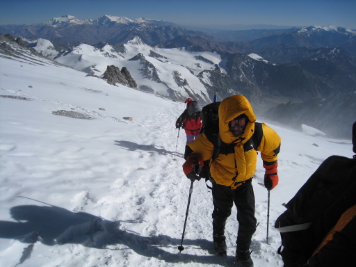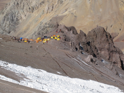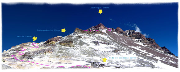 Nido de Condores to Berlin Camp is about four-hour hike to 5940 metres, on rock and snow. Everything required for summit day will be carried up in one load normally, so heavy rucksacks are normal. Another option is to hike a little further to Camp Colera (5980m) which is a little more exposed but has more space. This is a dramatic place to camp with exceptional views over the Andes. We try hard to get some rest, liquids and food into us before attempting to reach the summit.