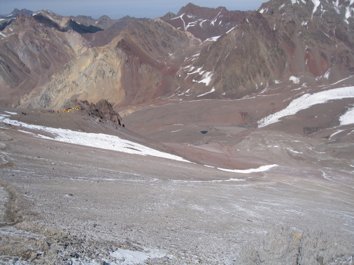 The descent back to base camp at Plaza del Mulas is over two days. Either sleep again at the top camp after the summit attempt and the next morning return to Nido de Condores to pick up the remaining gear and brave a very heavy rucksack back down to base camp. Or pack up the tent and get down to Nido straight away, and descend to base the next morning.