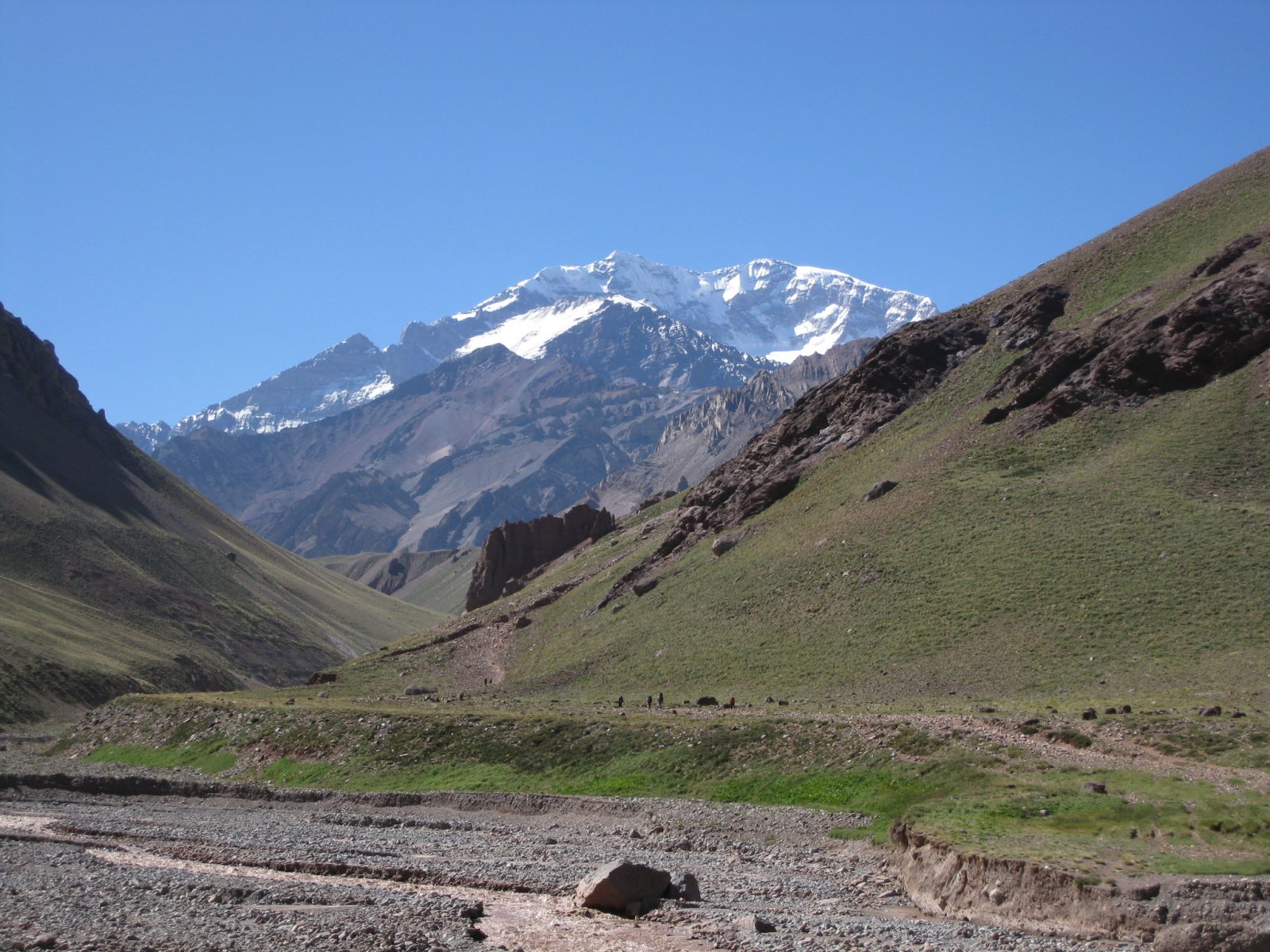 This route ascends the mountain by the second most popular way, called the Vacas Valley Route (also called the Polish Glacier Route, although it does not go on the glacier but skirts around the base of it). This route is quieter. Only 35% of all climbers on the mountain take this route, and it has superior countryside, vistas, greenery, flora and fauna. It also has a longer walk-in which is good for acclimatisation, although the base camp is the same altitude as Plaza del Mulas on the other side.