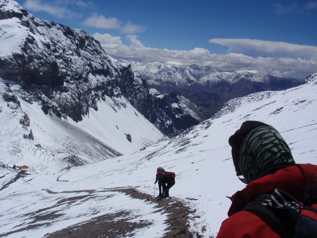 The downside of this side is that the summit day can begin from Camp 2, which is at 5600 metres, slightly lower than the Berlin Hut on the other side, which means a longer round trip to the trip (around 12 hours is normal). It’s possible to put in a further camp at Colera which is 6000 metres but this is a significantly difficult day to get the gear this high from Camp 2. Some people do a traverse – carry gear all the way to Camp Colera at 5980m for the final push to the top, and then descend all the way to Plaza del Mulas. This is a great journey but physically demanding. We generally go up and down the same way, unless there is a specific desire in the team to do the traverse.