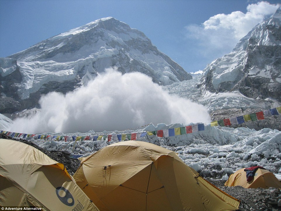 Avalanche approaching base camp of Everest. You can see my sleeping bag drying on top of my tent.