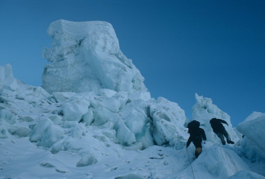 The Icefall up to Camp 1 is much more unstable now because it is warmer, so you have to climb at night to avoid the seracs collapsing around you. To climb in the afternoon on any snow-covered mountain with the sun on it is a foolish act, but to do it in the Icefall would be risking real death.