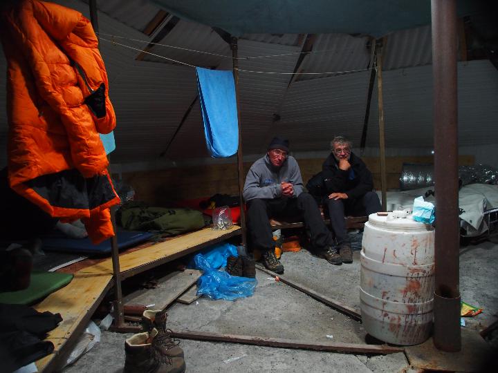 A new smaller hut called the Diesel Hut was built nearby in 2002, named for the fact that it had a diesel generator, and it became the default ‘high camp’ for climbers. Built of stone with an aluminium roof it was absolutely freezing downstairs, but if the sun was out the communal upstairs sleeping area was like a sauna and we regularly played cards there in our pants.