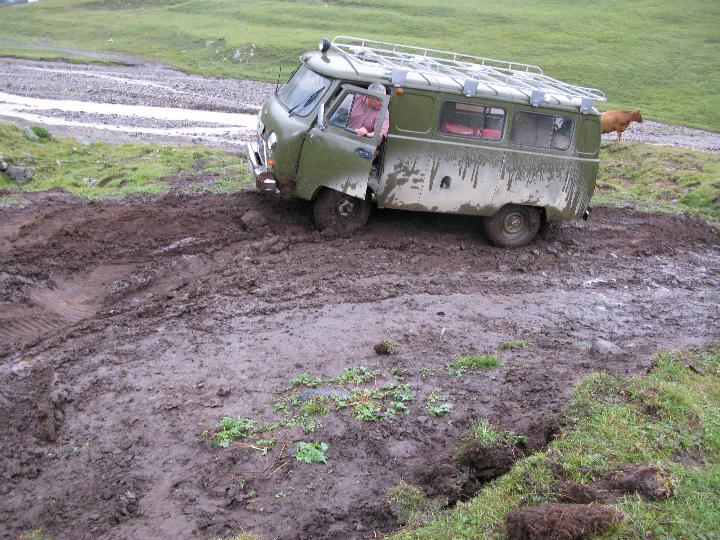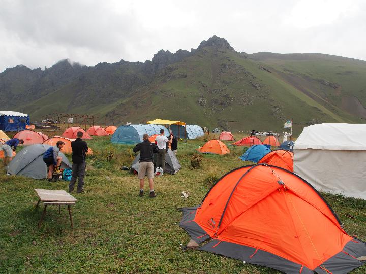 The base camp is just a collection of tents in a field by the stream and it is reached by using a Russian minibus which takes about four hours, two of which are off-road and the last part requires the driver to cross a small river.