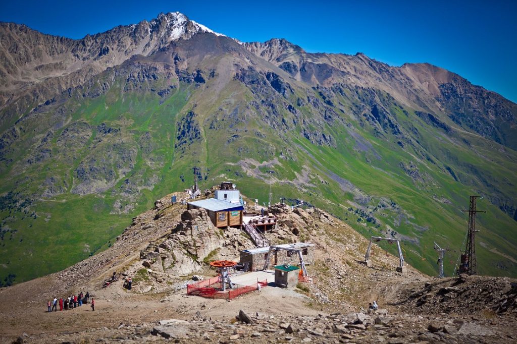 Then you had the choice of taking a chair lift to 3750 metres that often stopped for disconcertingly long periods of time, leaving you dangling in the cold gazing out at the Caucasus Mountains. The seats were plastic chairs screwed to a metal bar so you were completely alone, although you could shout across to the person behind or ahead to pass messages. It was vital to take your down jacket on this chair lift journey or better still, walk.