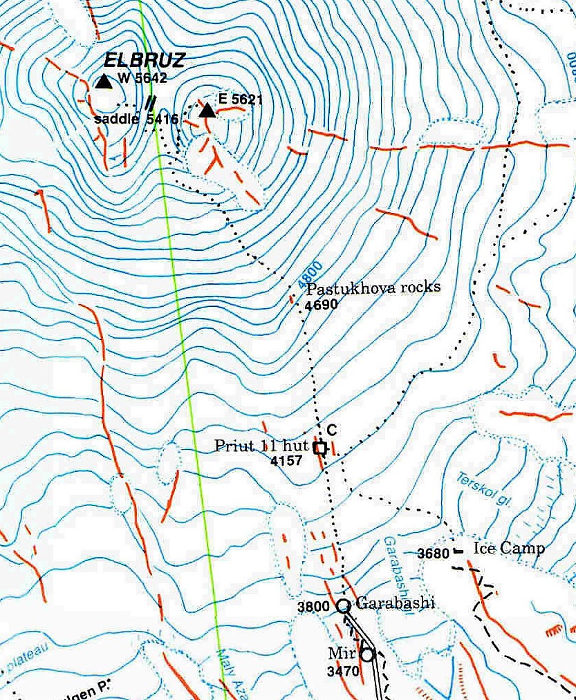 A further small hut was built in 1930 at 5350m metres between the two summits at what is known as ‘The Saddle’. A tragic event occurred in 1936 when a large group of climbers attempted to climb Elbrus in the winter; one person slipped on the hard exposed ice and knocked the other climbers off like skittles as he careered down the slope. Many people died on the ensuing fall five hundred metres down to Pastukhov Rocks. This hut doesn’t exist any more, except for some bits of broken wood.