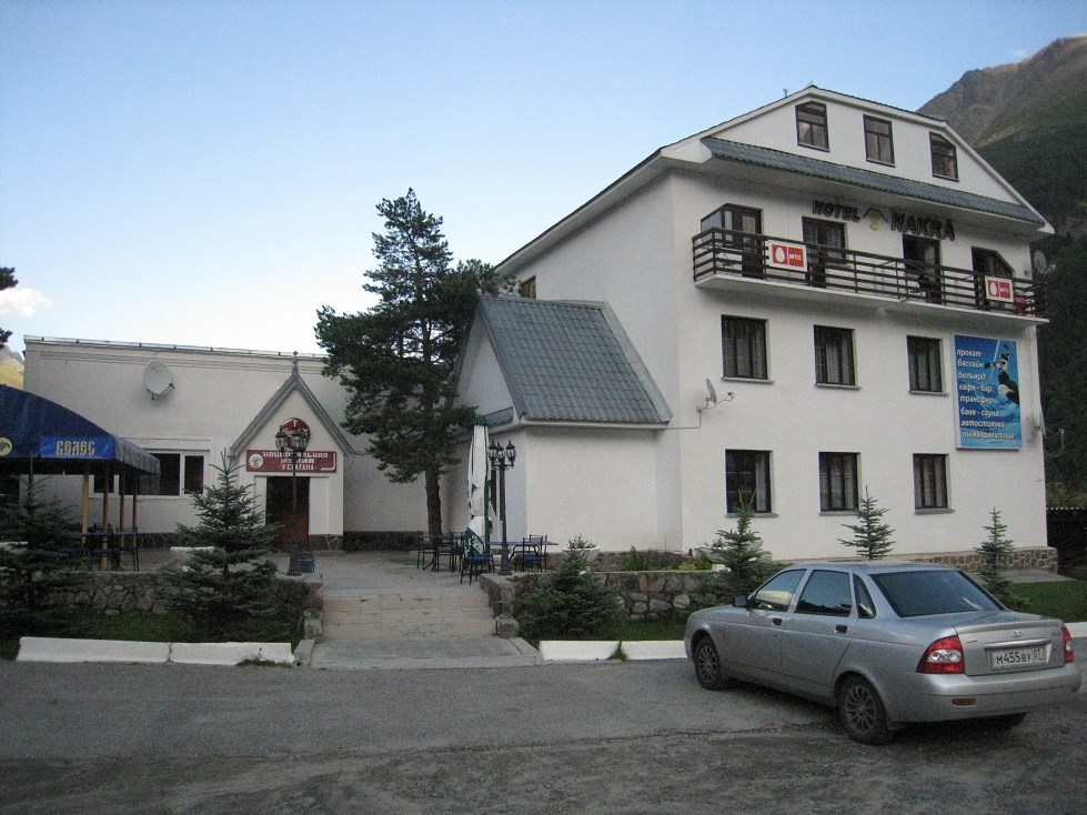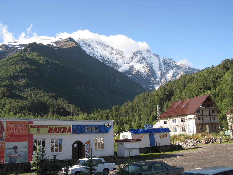 Down in the valley we use the Nakra Hotel (below left) in the village of Cheget (below right) for our base. The owner is a local Balkarian and ex-Soviet ski champion. Like most of the locals, he has made a living from the mountain, but he has to work within a local business environment that has constant competition from financial speculators from Moscow.