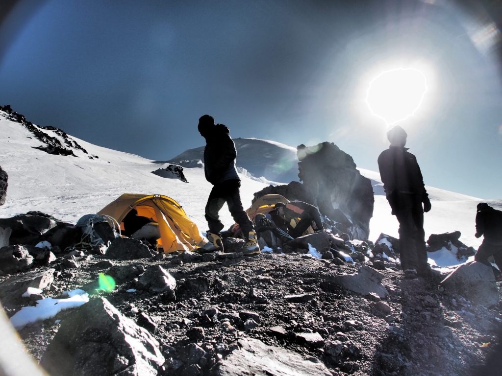 Above the top hut is one final camp – for optional use depending on weather – which is a campsite on the ice next to some rocks called Lenz Rocks. The altitude is 4600m and it does reduce the summit day time by about four hours in total, but the downside is carrying the gear to this altitude, putting up the tents and trying to get a good nights sleep before a big summit day.