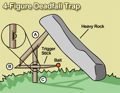 To make a deadfall trap you need a large rock, two sticks about the diameter of a C battery and 5″ long, a strong, thin stick, about the diameter of a pencil and a knife.