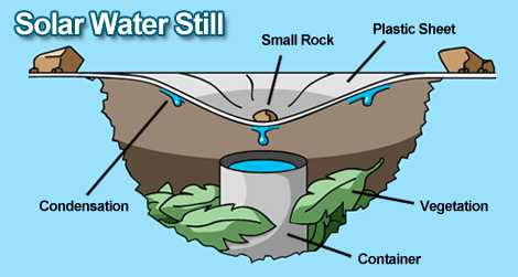 - Condensation will occur on the underside of the sheet and run down to the middle and drip into the container with distilled drinking water.