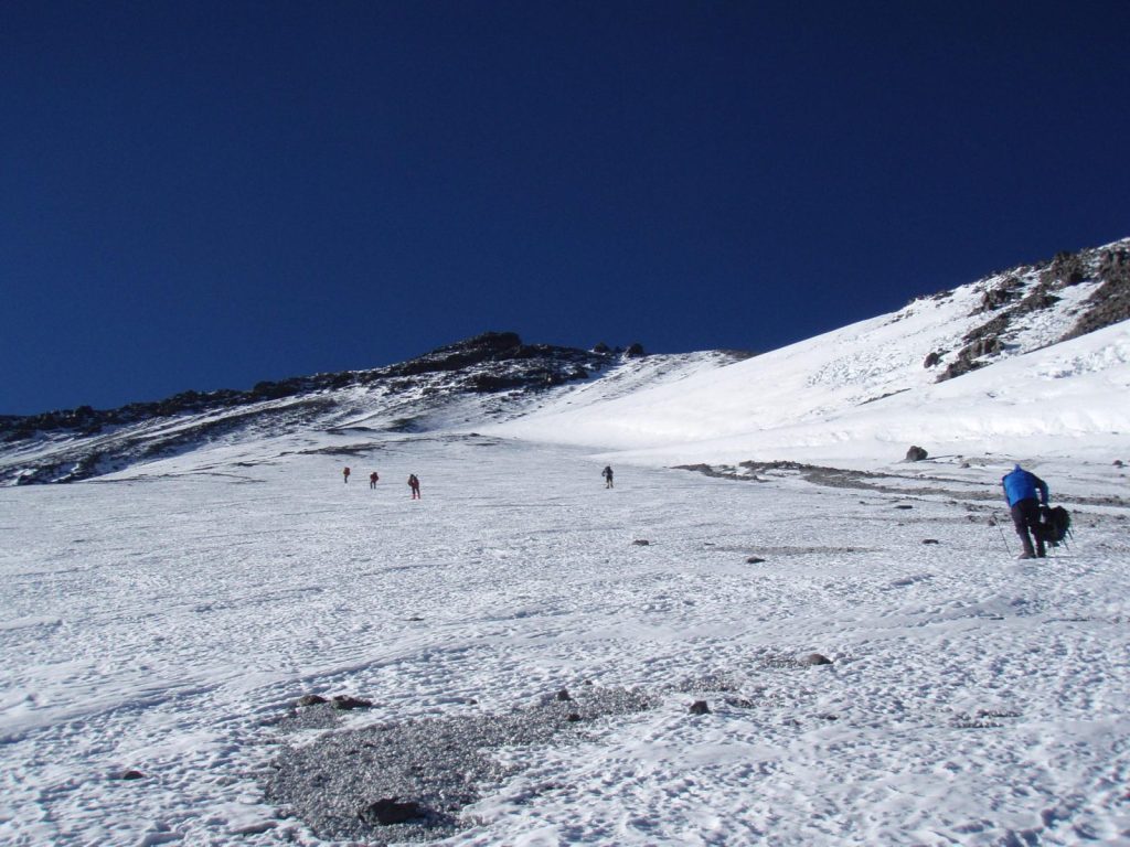 If the weather is cooperative a summit attempt of Ojos Del Salado 6893m. It will take 8-9 hours to reach the summit. Temperatures may be down to -20c with strong winds. Initially on a good rocky footpath to 6000m, then gain height with a series of zig zags on snow, then a long rightwards traverse to the crater of the volcano. The going is very slow and cold, and there are potentially penitentes fields to navigate.