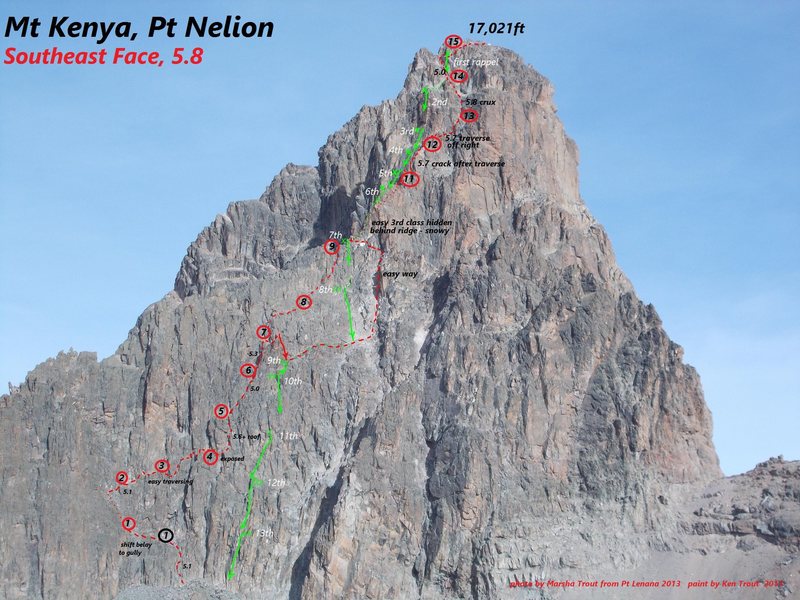 After the trek in and acclimitisation on the Naro Moru or Sirimon route, the technical climb is normally completed in one long day as a series of 18 – 20 pitches, although it is possible to bivouac on the summit in the Howell Hut and descend the next day.