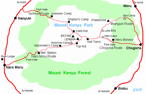 This traverse of Mount Kenya combines an ascent on either the Sirimon route or the Naro Moru route on the western side to Point Lenana and a descent of the Chogoria route on the eastern side of the mountain.