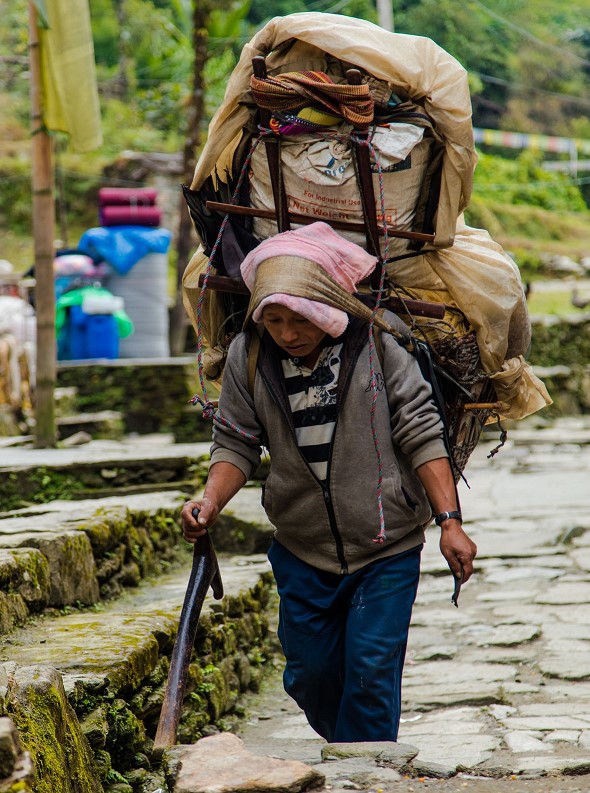 Big expeditions use yaks to carry all the climbing equipment to the base camp of a mountain and that is a traditional image of how things are carried in the Himalayas. But for the shorter trekking peak trips and the treks, all the equipment and trekkers clothing is carried by people. In fact as you trek in Nepal you will see that pretty much everything is carried by people, from wood and stone to all the items for selling in shops, mattresses, beer, water, and even elderly people.