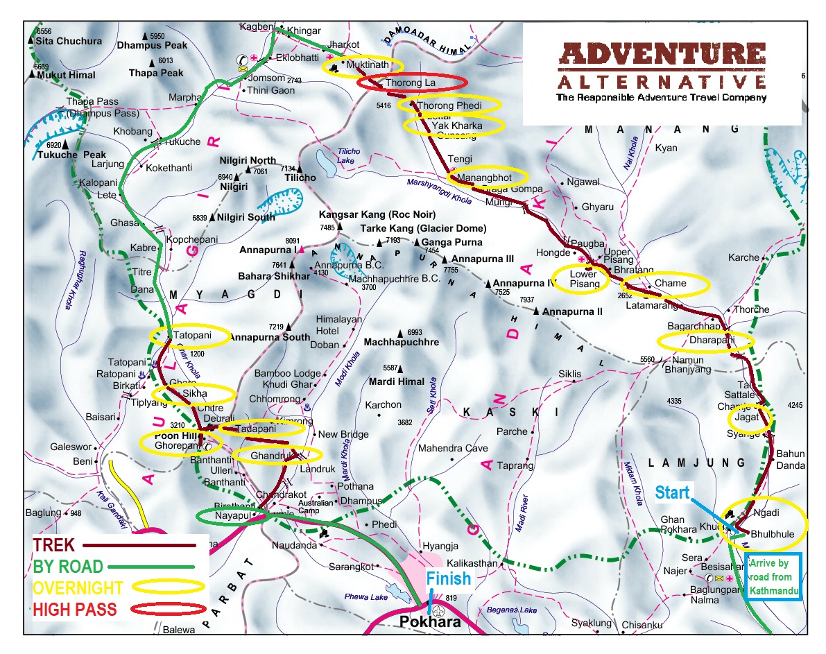 We generally have groups of 4 – 6 people, and you will be led by Sherpa guides who have worked for us, for many years. The groups meet up in Kathmandu where we have a guesthouse if you wish to use it, or we can book one of the many hotels in the capital. Kathmandu is at an altitude of 1400m. The following day is a rest and briefing day, then on day 3 we travel by road to Bulbule followed by a 2hr walk to Ngadi which is at 900m. Day 4 is the start of our main trek and we then have a gradual height gain each day followed by a few days walking high and sleeping low before going over the 5412m Thorung La pass. After the pass we rapidly drop altitude to sub 2000m. Our circuit will bring us to Pokhara at the end of the trek and after a rest day there, we fly back to Kathmandu.