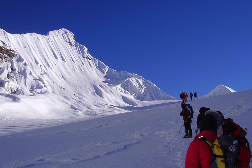 From crampon point the route is on snow and there are numerous crevasses to cross and you will be roped up in groups of three or four on glaciated ground. Some of the crevasses are deep and there will be ladders to negotiate, which are not difficult but do require care and alertness. The route is normally well marked, and groups only follow one designated ‘path’ on the glacier because there is a danger of falling into slots or hidden crevasses if you stray too far.