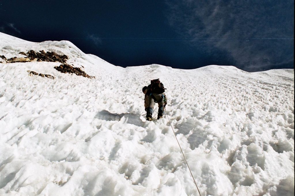 At the base of the headwall you will move onto the fixed lines which need to be checked for their robustness. The anchors are normally strong and every thirty metres or so, but especially in the afternoon they can become loose. The lines themselves are normally polyprop (not kernmantel) and can get icy and slip through jumars. The gradient is around 40 degrees at it’s steepest but averages less than that. There are plenty of places to rest for a bit, and the whole headwall of 300 metres normally takes about an hour and a half. Quite often you can find yourself behind other parties, which slows things down.