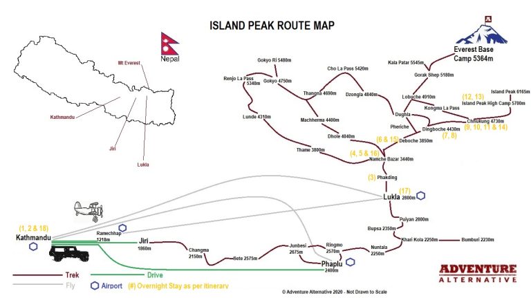 The Island Peak expedition is a minimum 19 days when you include days in Kathmandu and has 16 days on trek / climb. We do recommend allowing extra time for potential flight delays getting into and out of the mountains.