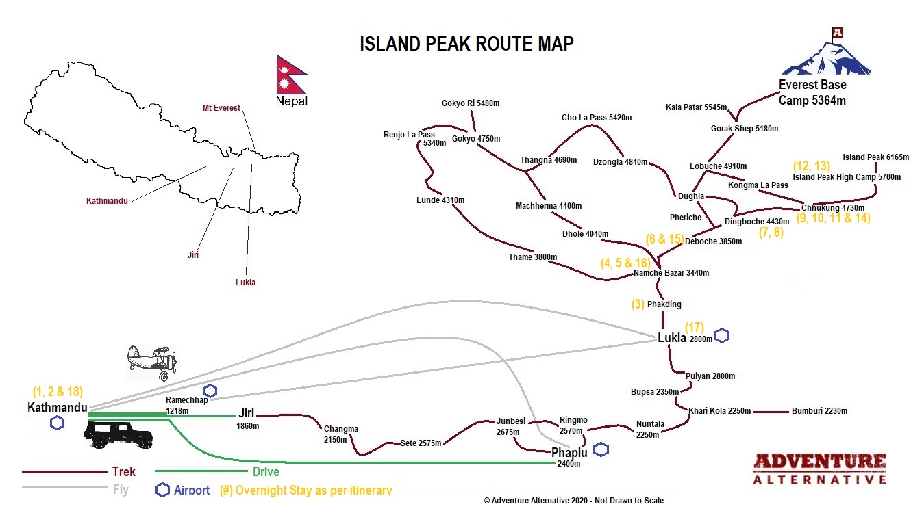 Note: some people like to also complete the trek to Everest Base Camp prior to climbing Island Peak. If you would like to do this then add two days to the trip and contact us to arrange. Remember to always allow leeway for the return flight home because the mountain flights in and out of Lukla are often delayed by bad weather. We recommend a minimum of 24 hours but 48 hours is better