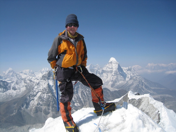 After climbing the 300 metre headwall and ascending the exposed summit ridge, the view from the top brings the thrill of Himalayan mountaineering because of the spectacular 360-degree panorama of many of the highest mountains in the world. Seen from the summit, the giant peaks of Nuptse (7,879m), Lhotse (8,501m), Lhotse Middle Peak (8,410m) and Lhotse Shar (8,383m) make a semi-circle to the north. The views of Makalu (8475m) in the east, Baruntse and Ama Dablam in the south add to the 360 panorama.