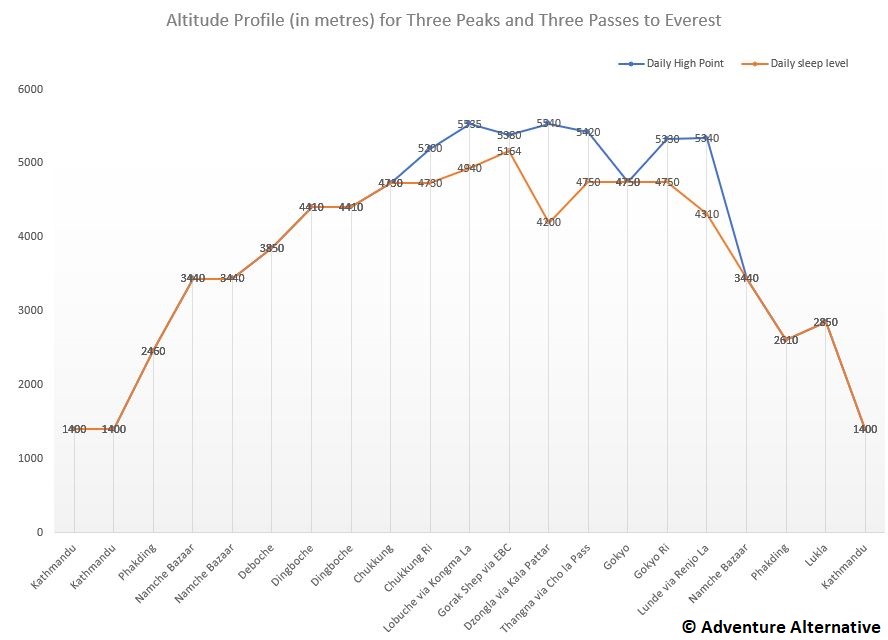 Our trek takes you to altitude over a controlled period of time. We don’t go over 5000m until day 10 of the itinerary or day 8 of the trek, which compared to the likes of Kilimanjaro is a lot slower giving you a good amount of time to acclimatise effectively. Only at Gorak Shep do we sleep above 5000 m and for one night. This is a challenging trek with high passes and three possible summits meaning that we go above 5000m on seven different occasions, but with a responsible itinerary that should give you a maximum amount of time to acclimatise.