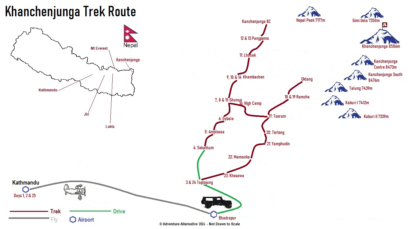 The trek begins at Taplejung which is a 45 minute flight from Kathmandu to Bhadrapur, followed by a jeep to Birtamod and then to Taplejung. The broad itinerary for the whole trek is below, and we visit the north base camp first.
