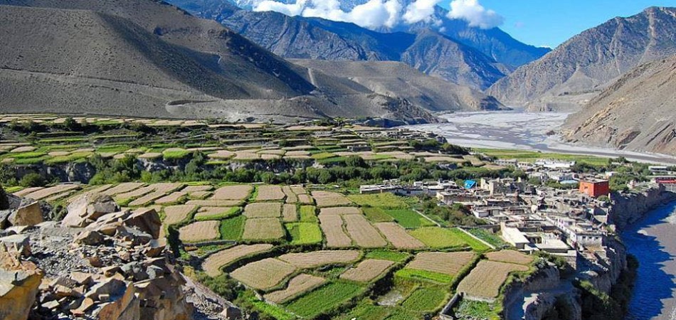 In common usage, the name Mustang refers to the arid Tibet-like region at the northern end of the Kali Gandaki (known to its inhabitants as Lo). Mustang has a long, rich and complex history that makes it one of the most interesting places in Nepal. The early history of Lo is shrouded in legend, myth and mystery, but there are records of events in Lo as early as the 8th century. It is quite likely that the Tibetan poet Milarepa, who lived from 1040 to 1123, visited Lo. In Lo itself the countryside is similar to the Tibetan plateau with its endless expanses of yellow and grey rolling hills eroded by wind. There is more rain in the lower part of upper Mustang and the hills tend to be great red fluted cliffs of tiny round stones cemented together by mud. Villages are several hours apart and appear in the distance almost as mirages; during the summer season, after the crops are planted, they are green oasis in the desert-like landscape.