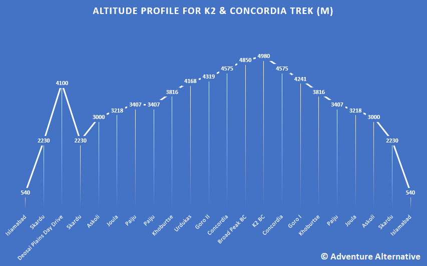 The itinerary below is for 21 days, starting and ending in Islamabad, and the actual trek is 14 days. Please note that the itinerary below should be regarded with a degree of flexibility as you will be travelling in a high mountain environment with a number of unknown influences including weather and rates of acclimatization of different individuals.