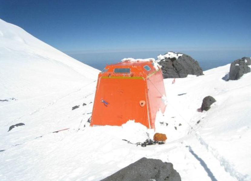 If an accident occurs in the saddle, or people become benighted for some reason, between the two peaks there is an emergency shelter with room for two or three people to sleep if necessary and a group to rest if the weather is bad. This hut is painted a bright orange. There are no supplies inside but it offers shelter and is a useful place to gather resources before descending.