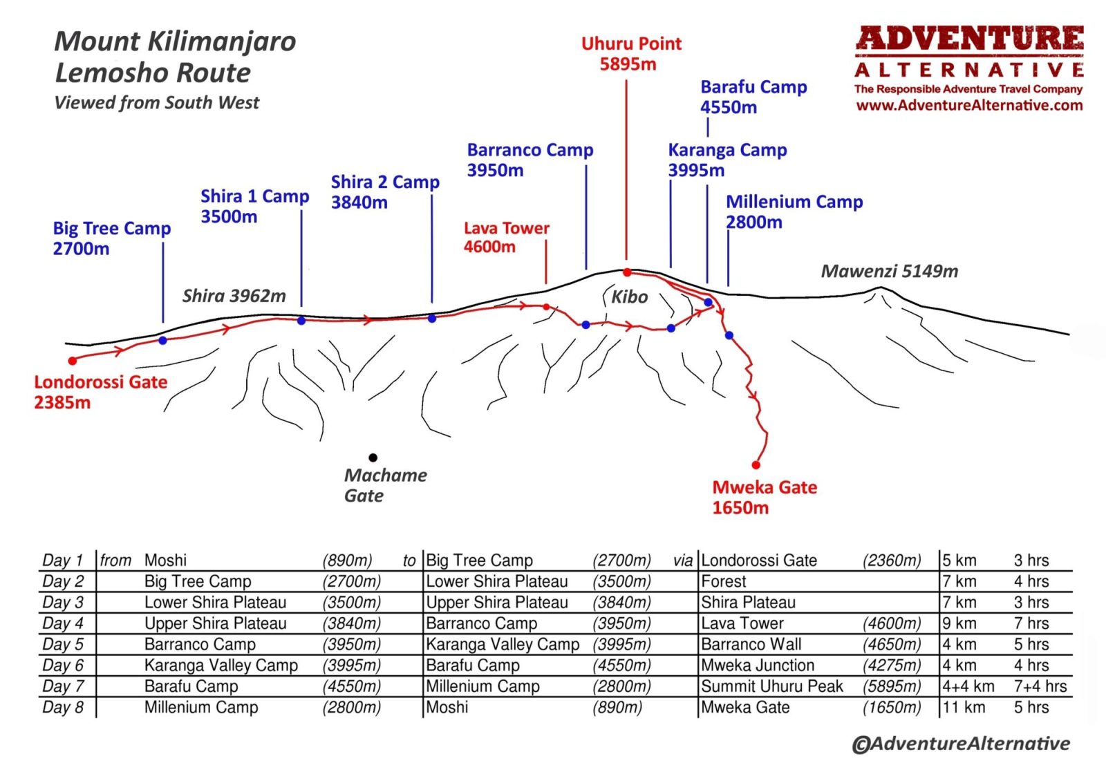 The Lemosho route, is the same as the Machame route after the second camp (Shira Plateau), but gives an extra day on the mountain.