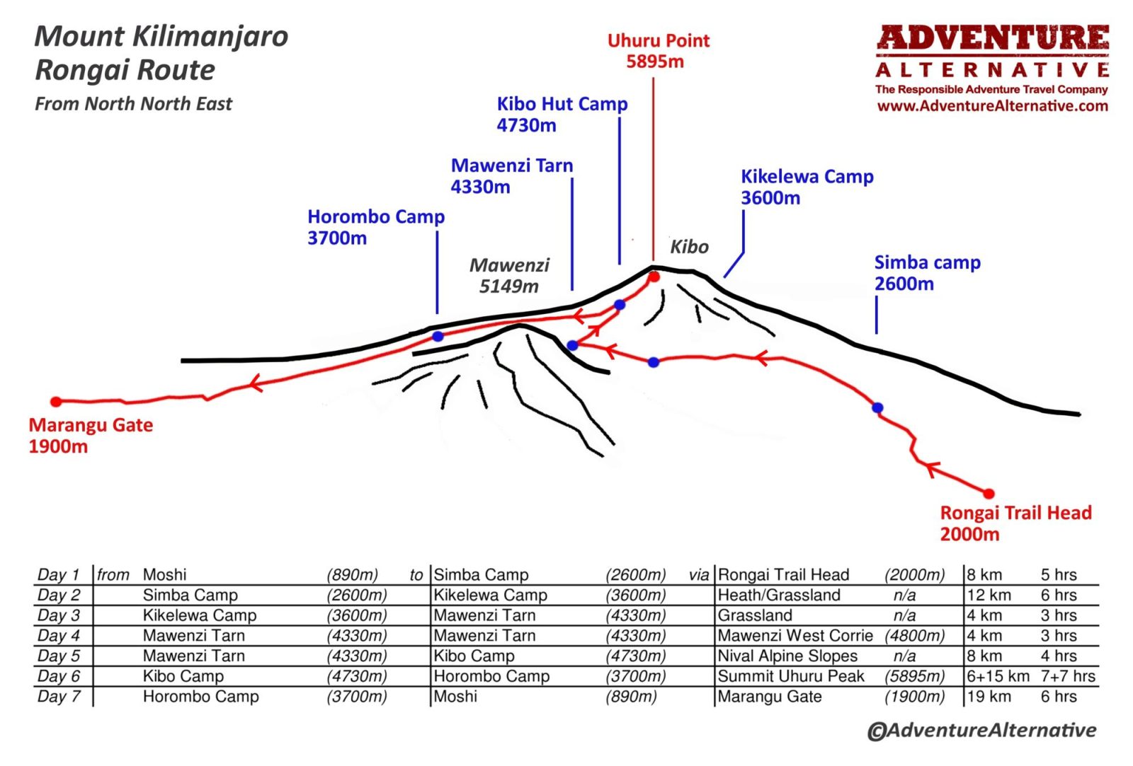 But to climb Kilimanjaro is expensive nowadays, the cost per day for a permit is over USD$100.00 so there is an incentive to try and climb the mountain faster. Given the time you could acclimatise on Mount Meru or even Mount Kenya first, but the majority arrive into Moshi airport and go straight up Kilimanjaro. All of the major guiding organisations like the UIAA recommend no less than seven days. Over several decades our experience shows that the success rate is about 95% for a seven day trip.