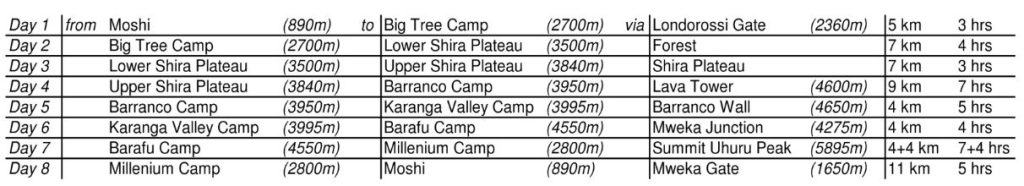 The 8 day version of the Lemosho route below is 11 days in total including the days in Moshi.
