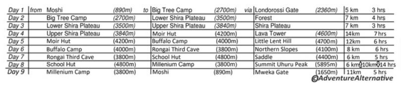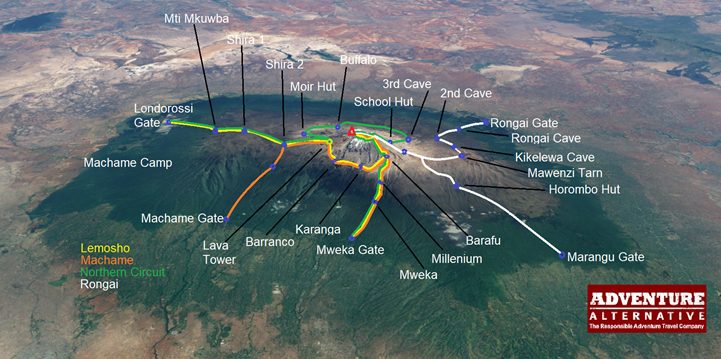 Also the altitude gain each day is less than on other routes, with a gentle gradient until reaching Kikelewa or Third Caves camp, therefore over nine days the likelihood of altitude sickness is significantly less. Yet the overall length of the route is 96 kilometres, not much more than the other routes. An alternate route which summits directly up the northern slopes from School Hut is about 79 kilometres.