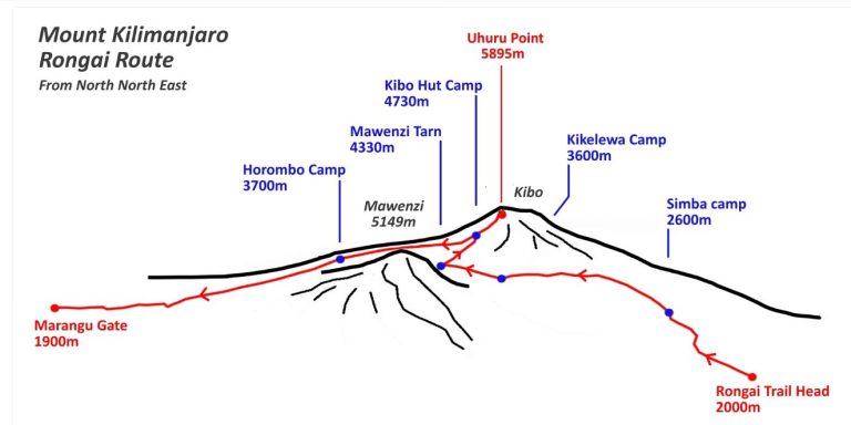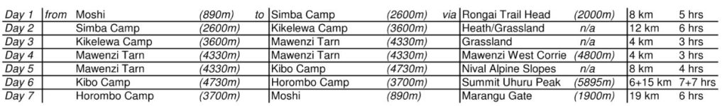The seven days includes a day of acclimatisation at Mawenzi Tarn and this is an important addition because the flatter terrain means you can’t ‘climb high, sleep low’ which is a good approach to acclimatisation. This extra day helps a lot and means the summit success rate on this route is quite high at over 80%. A six day itinerary without the acclimatisation day lowers the summit success rate to about 65% and it’s much more likely to get altitude sickness.